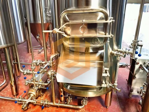 精釀啤酒設備使用的過濾槽與旋沉罐:采用上下兩層的設計方式,整體占地面積小,過濾槽采用銑制篩板,頂部采用異型人孔設計,側面配有出糟口,方形人孔門設計更有利于啤酒麥糟的清理工作,同時還配有出糟板。內部配有耕刀裝置,用于疏松麥糟層以及出糟使用。